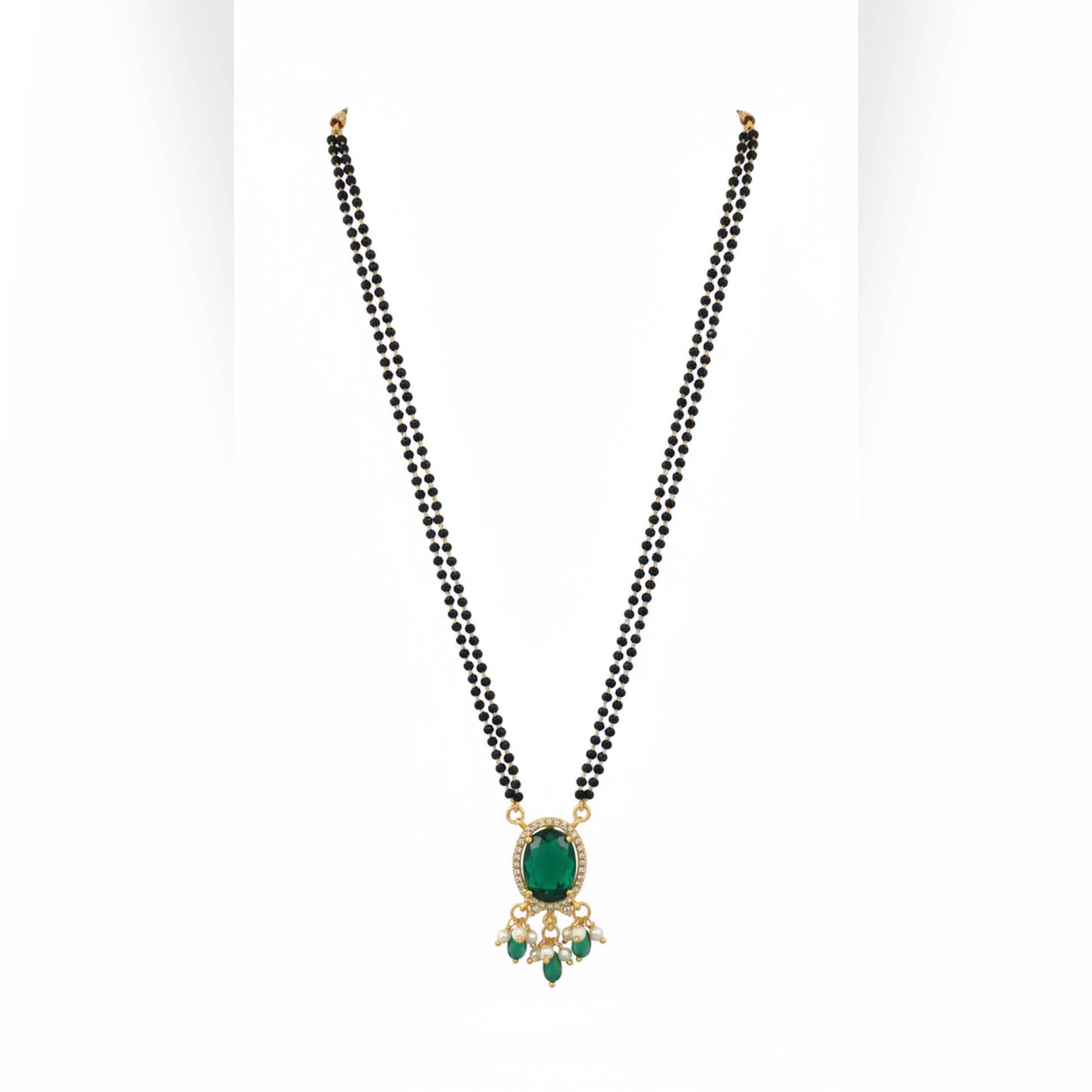 This beautiful mangalsutra features two strands of classic black beads, symbolizing tradition and marital commitment. The centerpiece is an oval green stone pendant, adorned with delicate golden accents and small green and pearl droplets, blending heritage design with a touch of modern elegance. Ideal for daily wear or special occasions, this mangalsutra is a timeless addition to any jewelry collection.