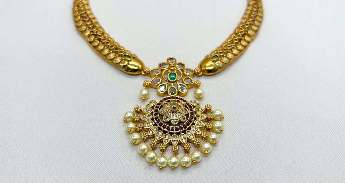 Elevate your elegance with the Gold Kanti Necklace, exquisitely adorned with lustrous white pearls. This premium design combines the timeless appeal of gold with the sophisticated glow of pearls, making it a highly sought-after piece for any special occasion. Its refined craftsmanship ensures lasting beauty and a graceful statement that complements both traditional and contemporary styles.